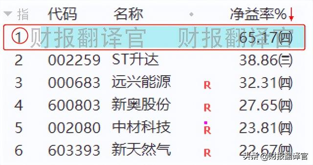 这是一家在天然气板块赚钱能力排名第一的上市企业,公司的盈利能力,也就是净资产收益率高达65%。