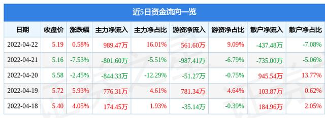 资金流向数据方面,上个交易日主力资金净流入989.47万元,游资资金净流入561.6万元,散户资金净流出437.48万元。近5日资金流向一览见下表: