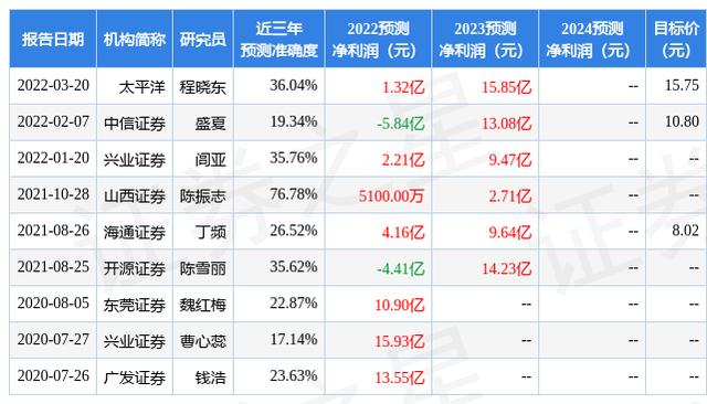 证券之星数据中心根据近三年发布的研报数据计算,山西证券陈振志研究员团队对该股研究较为深入,近三年预测准确度均值为76.78%,其预测2022年度归属净利润为盈利5100万,根据现价换算的预测PE为188。