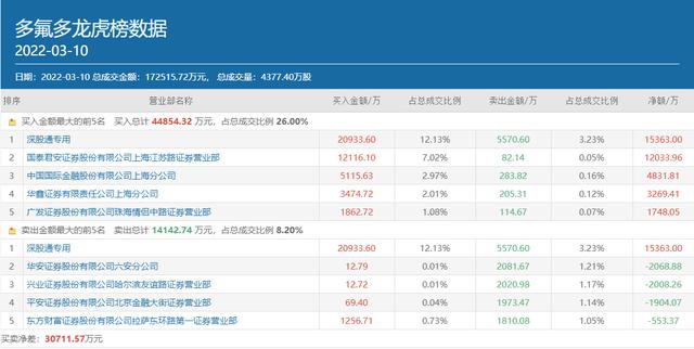 值得一提的是,3月10日,除了章盟主以外,多氟多还获得了北上资金的青睐,深股通专用席位高居该股买方榜首,净买入金额为1.54亿元。