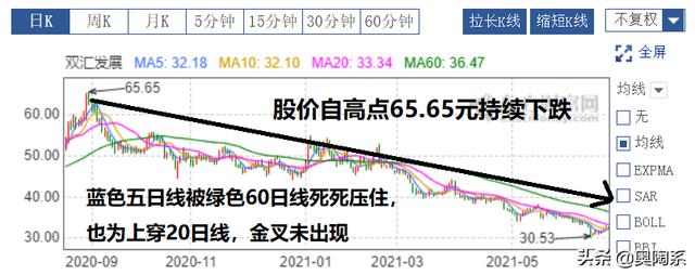 双汇发展自2020年8月攀上最高点65.65元之后,便开始下跌,下跌过程中始终未上穿30日线和60日线,有三次反弹时短暂上穿20日线和10日线,但是都仅能持续2-3个交易日,不能形成有效的突破,如果能够上穿30日线,出现第一次金叉,可作为第一个买点,轻仓试验,后期若再出现第二个金叉,或者是第一次突破后便大举上攻成交量明显放大,则可以大量买进,否则金叉可能不成立还有下跌的可能。只有5日线有效突破30日线才是一个积极的买入信号。