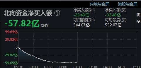 两市盘中约3800只股票下跌,北向资金再度出现净卖出,今天上午半天净卖出额57.82亿元。