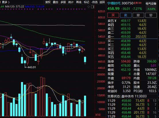 新能源车赛道股集体大跌,宁德时代盘中大跌逾8%,港股市场“蔚小理”股票集体大跌。