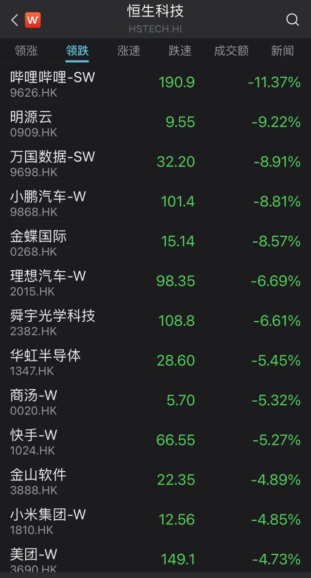港股互联网股和科技股今天上午再度大幅调整,恒生科技指数盘中一度大跌逾4%。恒生科技指数成份股中,哔哩哔哩-SW、万国数据-SW、金蝶国际、明源云盘中跌幅超过10%。腾讯控股、阿里巴巴-SW等“大象级”互联网股跌幅较小。