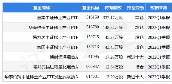 根据2022Q1季报基金重仓股数据,重仓该股的基金共7家,其中持有数量最多的基金为嘉实中证稀土产业ETF。嘉实中证稀土产业ETF目前规模为25.17亿元,最新净值0.9539(4月25日),较上一交易日下跌9.07%,近一年上涨1.5%。该基金现任基金经理为田光远。田光远在任的公募基金包括:嘉实恒生中国企业ETF(QDII),管理时间为2021年6月4日至今,期间收益率为-37.57%;嘉实中证软件服务ETF,管理时间为2021年6月4日至今,期间收益率为-37.35%;嘉实中证科创创业50ETF,管理时间为2021年6月25日至今,期间收益率为-45.11%。