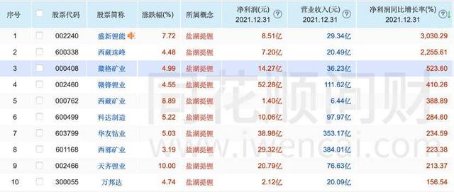 与此同时,位于产业链上游的“盐湖提锂”概念公司在这一年里也尝到甜头。同花顺数据显示,30家概念股公司中,净利润涨幅前三的公司分别为盛新锂能、西藏珠峰、藏格矿业,净利润分别同比增长3030.29%、2255.61%、523.60%。