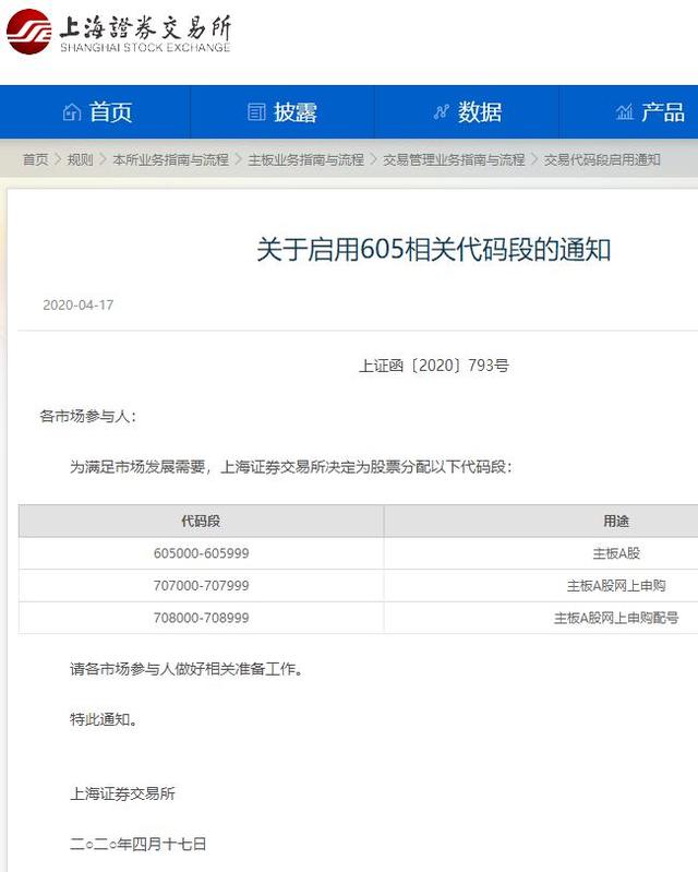 上海证券交易所在4月17日发布通知称,为满足市场发展需要,决定为股票分配新代码段,其中,605000-605999代码段用于主板A股,707000-707999代码段用于主板A股网上申购,708000-708999代码段用于主板网上申购配号。