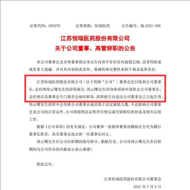 本文摘要:每经编辑:毕陆名7月9日晚间,恒瑞医药(600276,SH)突然发布公告称,江苏恒瑞医药股份有限公司(以下简称“公司”)董事会近日收到公司董事长、总经理周云曙先生的辞职报告,周云曙先生因身体原因申请辞去公司董事长、总经理以及董事会专门委员会… …