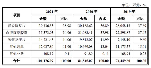 报告期内,天津同仁堂收入和毛利主要来源于肾炎康复片、血府逐瘀胶囊和脉管复康片三种产品。2019 年-2021 年,上述产品的合计销售收入分别为6.31亿元、7.11亿元和8.9亿元,占各期营业收入的比重分别为 84.76%、86.85%和 88.00%,合计毛利分别为5.4亿元、6.15亿元和7.69亿元,占各期毛利总额的比重分别为 89.46%、91.56%和 91.64%。