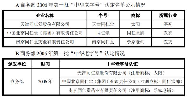 天津同仁堂则表示,起源于清朝时期的张家老药铺,历史上曾使用京都同仁堂张家老药铺、京同仁堂和记、天津市同仁堂制药厂、天津市先锋中药厂、天津市第四中药厂、天津同仁堂制药厂等名称开展药品经营活动。2002 年经天津市人民政府批准,天津同仁堂股份有限公司发起设立。2008 年更名为天津同仁堂集团股份有限公司,2006 年“天津同仁堂股份有限公司(注册商标:太阳)”成为商务部认定的第一批“中华老字号”,同一批被认定为中华老字号的也包括“中国北京同仁堂(集团)有限责任公司(注册商标:同仁堂牌)”。