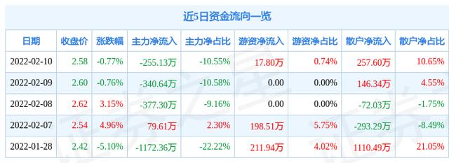 资金流向数据方面,上个交易日主力资金净流出255.13万元,游资资金净流入17.8万元,散户资金净流入257.6万元。近5日资金流向一览见下表: