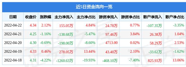 资金流向数据方面,上个交易日主力资金净流入155.05万元,游资资金净流入24.78万元,散户资金净流出107.35万元。近5日资金流向一览见下表: