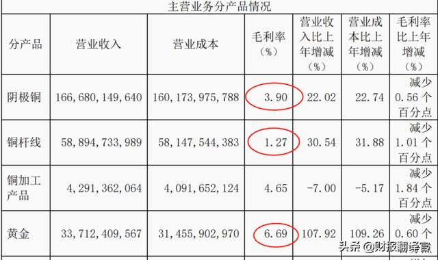 阴极铜的毛利率只有3.9%,铜杆线的毛利率为1.27,真是低得离谱。江西同业如果没有几个全国第一的竞争优势在手,估计都死几回了。