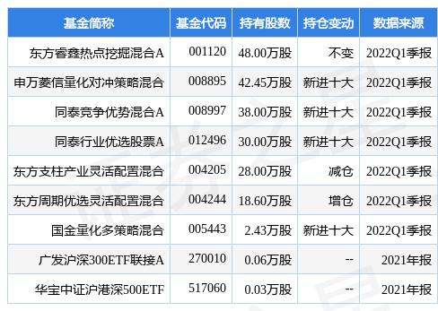 根据2022Q1季报基金重仓股数据,重仓该股的基金共7家,其中持有数量最多的基金为东方睿鑫热点挖掘混合A。东方睿鑫热点挖掘混合A目前规模为0.79亿元,最新净值1.1848(4月22日),较上一日下跌1.05%,近一年上涨5.47%。该基金现任基金经理为张玉坤。张玉坤在任的公募基金包括:东方支柱产业灵活配置混合,管理时间为2020年3月20日至今,期间收益率为32.79%;东方周期优选灵活配置混合,管理时间为2021年3月22日至今,期间收益率为2.7%。