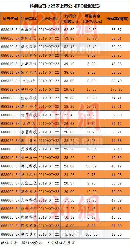 科创板首批25家上市公司IPO数据概览。制表:程春雨
