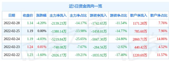 资金流向数据方面,上个交易日主力资金净流出2139.23万元,游资资金净流出1742.65万元,散户资金净流入1171.28万元。近5日资金流向一览见下表: