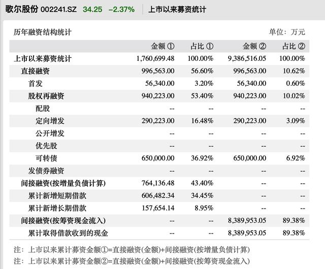 长期通过外部融资来进行输血才能维持公司的正常运营。Wind数据显示,自上市以来,歌尔股份通过融资的方式获得现金流合计176.07亿元。其中直接融资99.66亿元,包括IPO融得的5.63亿元,间接融资76.41亿元;累计分红 13次,累计分红金额为 25.80亿元。