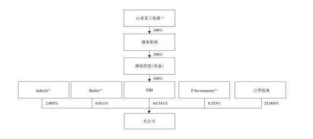 全球发售完成后,FIH(Ferretti International Holding S.p.A.)将直接持有发行人215,769,229股股份,占发行股本的64.541%。FIH由潍柴控股(香港)全资拥有,潍柴控股(香港)由潍柴集团全资拥有,潍柴集团为山东重工集团的全资子公司。