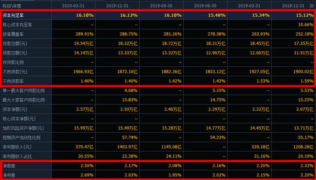 2020年一季度的情况也是不错,营业收入1867.06亿元,同比增长7.9%;净利润641.87亿元,同比增长4.79%;资本充足率为16.1%、拨备覆盖率为289.91%、不良贷款率1.4%、净息差为2.5%。不良贷款率较去年底的水平相同没升没降,净息差的水平较去年底有着明显上升。整体看一季度的情况,算是不错了。