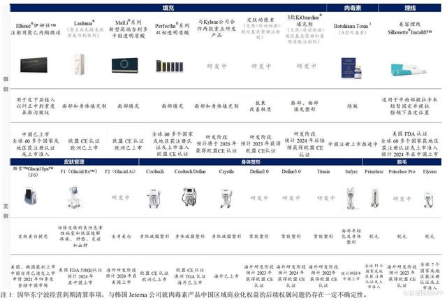 华东医药表示,公司将继续加快推进核心医美产品在国内外的临床注册工作进度及市场推广,通过纵向全面渗透全球医美高端市场,不断提升行业竞争优势。公司医美产业经过3 年高速发展,已实现阶段性战略目标,拥有无创+微创医美领域产品二十余款,产品数量和覆盖领域均居行业前列,其中多款潜力产品将有望于2025 年前陆续在海内外上市销售,为公司全球化医美业务带来新的增长动能。