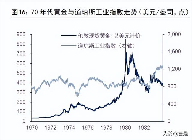 1971 年 8 月,美国总统尼克松宣布美元跟黄金脱钩,引入了工资-物价管制政策,此时黄金价格在 43 美元/盎司。此后随着石油危机的爆发,通货膨胀问题被进一步放大,黄金价格持续上涨,在 1973 年 5 月突破100 美元/盎司。1973-1975年间出现了一次大幅度的经济衰退,黄金价格震荡向上,最高触及195 美元/盎司。