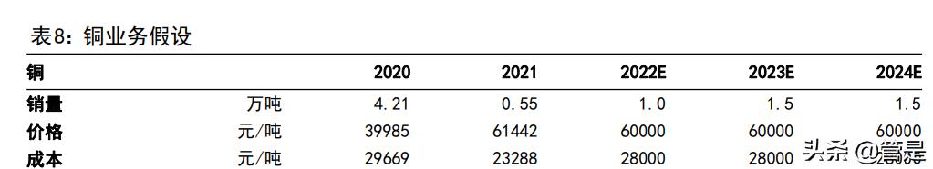 铜:销量方面,随着 Sepon 铜金矿转向主要生产黄金,电解铜产销量预期保持较低水平,我们假设 2022-2024 年,公司铜销量分别为1.0/1.5/1.5 万吨。价格方面,对于美联储货币收紧力度的担忧叠加俄乌冲突影响,使市场风险偏好下降,铜价走势受到抑制,但全球铜显性库存处于历史低位,且新能源领域用铜需求快速增长,对铜价形成有力支撑。我们假设 2022-2024 年,铜(不含税)价格保持6.0 万元/吨。