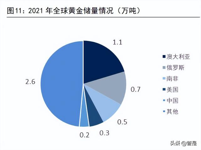 黄金拥有商品属性、金融属性及货币属性,兼具抗通胀功能和避险功能。自布雷顿森林体系瓦解以后,黄金价格不再与美元直接挂钩,其走势受到货币政策、通胀水平、避险需求等多种因素综合影响。 全球黄金储量低,供应相对稳定。黄金资源储量较低,但分布广泛,美国地质调查局数据显示 2021 年,全球黄金储量约 5.4 万吨,其中澳大利亚、俄罗斯、南非储量相对丰富。黄金供应主要包括矿产金和回收金,2021 年全球黄金供应量为4666 吨,其中金矿产量为 3561 吨。可以看到 2010 年来,全球黄金年供应量保持在 4300-4900 吨水平,波动较小。