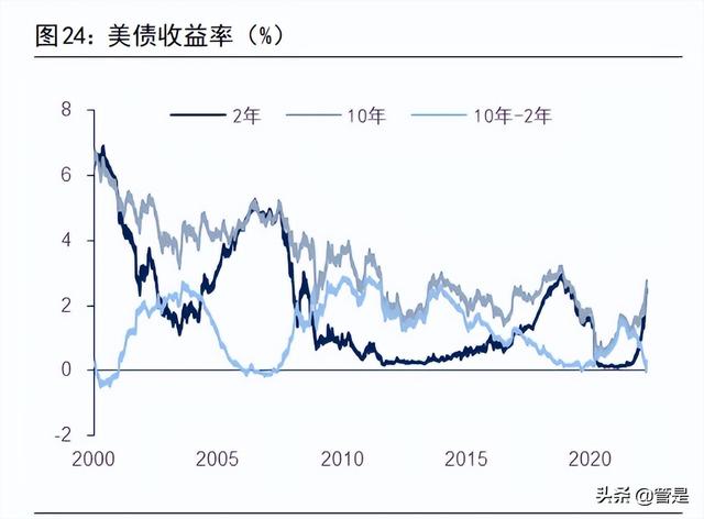 经济面临衰退风险。美联储 3 月议息会议纪要释放鹰派信号,通胀压力下,加息缩表节奏加速升温。4 月初,2 年期和 10 年期国债收益率出现倒挂。一方面通胀走高,美联储宣布进入加息周期,推高短端利率;另一方面,市场对经济前景的担忧令长端美债收益率走低。2000 年来,美债 2 年和10 年期收益率共发生过3次倒挂,分别在 2000 年、2006 年和 2019 年,其后分别发生了互联网和科技股泡沫、全球金融危机、全球疫情冲击。美债收益率倒挂,再度引发市场对于经济衰退的担忧。