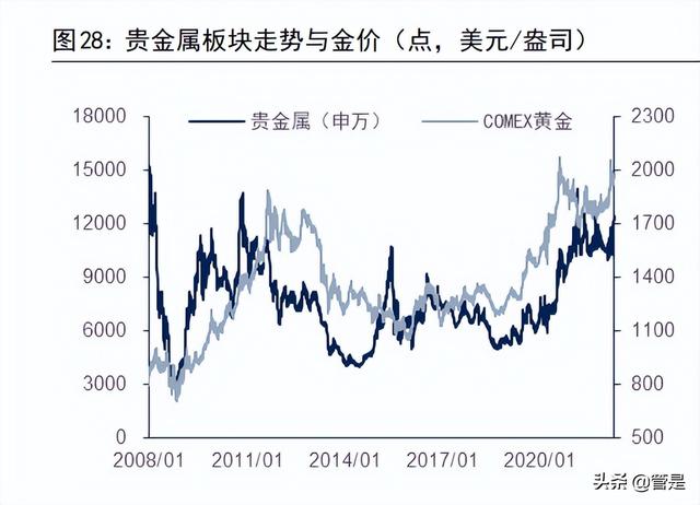 黄金股与金价走势趋同,且容易出现“戴维斯双击”。通常情况下,商品价格出现大涨之后会引发供给端的响应,企业盈利增厚,进一步扩大资本开支带来产量上行,远端价格会出现向下压力,存在明显的“自我减速机制”。但是这个规则对于黄金来说是失效的,因为黄金供应相对稳定,又具备强金融属性,与美元实际利率的变化密切相关,金价上行过程会提振黄金的投资需求,黄金股容易出现“戴维斯双击”,表现出较金价更大的弹性。