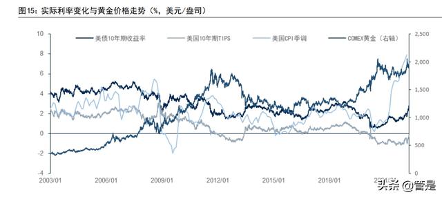 黄金价格与实际利率呈现负相关关系。区别于大宗商品,黄金本质上来说是金属货币,价格波动不单纯受供需关系影响。在美元与黄金脱钩后,黄金已不再直接发挥货币职能,但仍具有强烈的货币属性,其涨跌体现出与信用货币的地位博弈,特别是在负利率环境下,其货币属性价值进一步强化。从黄金的金融属性出发,其定价逻辑可简化理解为名义利率与通胀的相对运行节奏变化。在美元为主导的国际货币体系下,黄金不生息,而美国国债有息,美债收益率下跌会提升黄金吸引力。同时黄金是抗通胀的,而美元会随通胀贬值,高通胀预期会提升黄金吸引力。实际利率=名义利率-通胀预期,从历史数据来看,黄金价格也通常呈现出与美元实际利率的负相关关系。(报告来源:未来智库)