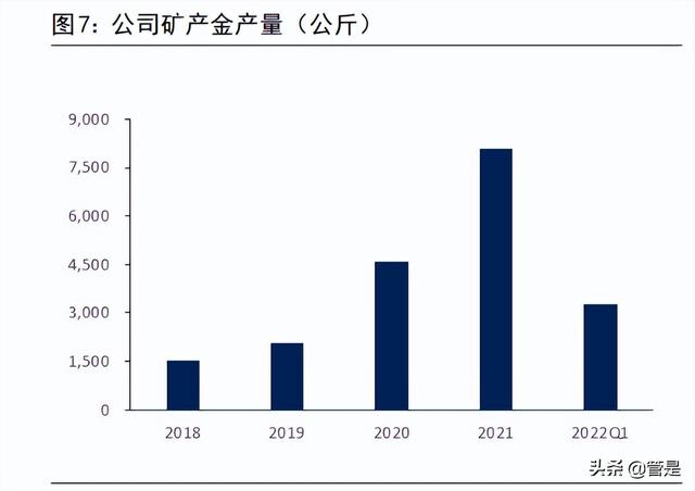 作为一家成长中的黄金上市公司,公司黄金产量持续提升。2021 年末,公司境内保有黄金资源量约 52.57 吨,境外老挝保有黄金资源量约158 吨,加纳约364.8吨。2021 年,在疫情和氧气站故障等不利因素影响下,公司黄金产能释放进度受阻,生产矿产金 8095.22 千克,同比大幅增长 76.42%。2022 年一季度矿产金产量3262.72 千克,同比提升 47.59%,公司 2022 年计划黄金产量不低于15.76吨。