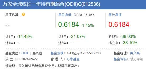 根据记者查询,万家全球成长一年持有期混合A、C成立于2021年9月22日,买入确认后锁定期12个月,期间不可卖出,也即目前仍处于锁定期。截至今年一季度末,其规模分别为12.70亿元、4.43亿元。