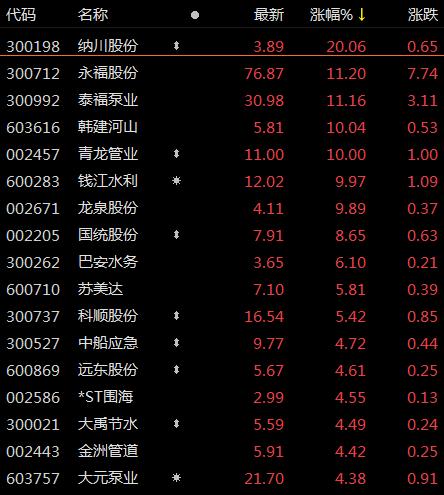 纳川股份当日涨20.06%至3.89元/股,获得主力资金净流入5887万元;公司是集管材研发、制造、管道修复、管道工程服务、管网投资运营为一体的埋地排水管网综合服务商。青龙管业7月21日股价涨10%,为国内产品品种最全、经营规模最大的供排水管道生产企业之一;公司7月13日披露,预计2021年上半年扭亏为盈,从去年同期亏损1760.43万元扭转为盈利3400万元至4800万元。