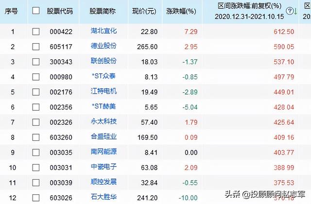 该数据是统计到上周五即10月15日收盘的。德业股份、南网能源、中瓷电子,这三个是刚上市新股,时间不足一年,其中德业股份605117作为具有储能、制冷剂等题材股价表现一直很优秀,甚至在周五的时候依然能够创出新高,按照开板后期正常交易价格到现在价格,涨幅也有4倍之多,表现非常的给力。在次新股中如此走势可以称为一只大牛股,在老股里的排名也能挤进前十名。