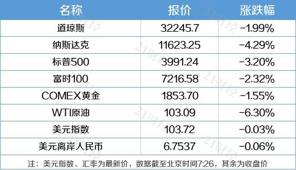 美国三大股指大幅收跌,道指跌1.99%,标普500指数跌3.2%,纳指跌4.29%。波音跌超10%,雪佛龙跌6.6%,VISA跌近5%,领跌道指。