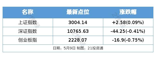 本文摘要:昨日A股5月9日,沪深指数全天缩量整理,题材炒作多点开花。截至收盘,上证指数涨0.09%,创业板指跌0.75%,深证成指跌0.41%;两市成交额0.67万亿元。港股周一因佛诞日假期休市一日,沪深港通交易暂停。盘面上,造纸、露营经济、建筑装饰… …