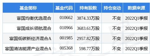 根据2022Q1季报基金重仓股数据,重仓该股的基金共4家,其中持有数量最多的基金为富国均衡优选混合。富国均衡优选混合目前规模为49.13亿元,最新净值0.7538(5月6日),较上一交易日下跌2.1%,近一年下跌22.75%。该基金现任基金经理为杨栋。杨栋在任的公募基金包括:富国低碳新经济混合A,管理时间为2015年12月18日至今,期间收益率为165.07%;富国清洁能源产业混合A,管理时间为2020年3月6日至今,期间收益率为72.9%;富国积极成长一年定开混合,管理时间为2020年6月15日至今,期间收益率为17.62%;