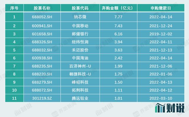 目前A股IPO发行,多采用余额包销方式,即发行人和保荐券商共同承担证券发行风险,当投资者弃购时,这部分弃购造成的余额将由保荐券商认购。以往大规模弃购新股较少发生,弃购金额超过1亿元的情况仅发生过11次,其中2019年有1次,2021年有3次,2022年则有7次之多。而在这7次之中,4月份就占了5次。