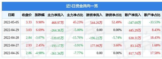 资金流向数据方面,5月5日主力资金净流入468.97万元,游资资金净流入544.26万元,散户资金净流出347.69万元。