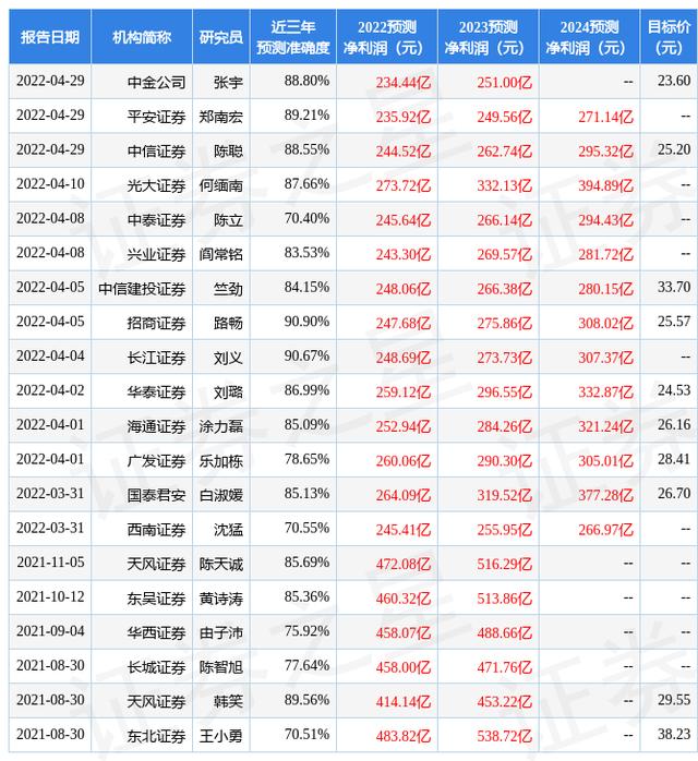 证券之星数据中心根据近三年发布的研报数据计算,招商证券路畅研究员团队对该股研究较为深入,近三年预测准确度均值高达90.9%,其预测2022年度归属净利润为盈利247.68亿,根据现价换算的预测PE为9.1。