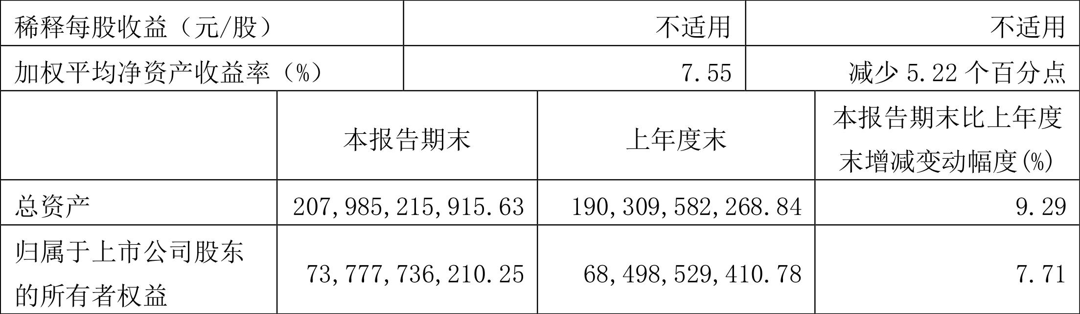 2022年一季度,公司加权平均净资产收益率为7.55%,同比下降5.22个百分点,环比下降0.18个百分点。