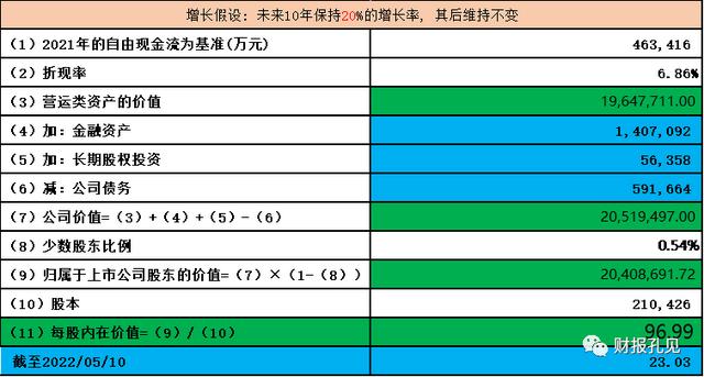 我们以2021年自由现金流为基数, 综合过往的营收和自由现金流增长情况, 假设未来10年复合增长率为 20%, 估值如下: