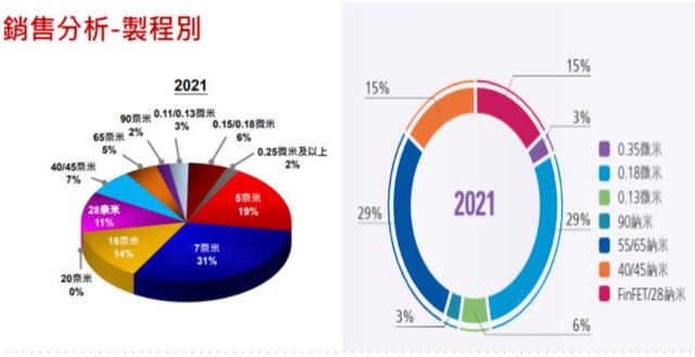 而体现在工艺方面的,台积电主要靠先进工艺赚钱,55nm及以上工艺贡献的份额只占18%,而5nm贡献19%、7nm贡献31%、16nm贡献14%,这里就合计占了64%了。另外28nm贡献11%、40/45nm贡献7%。