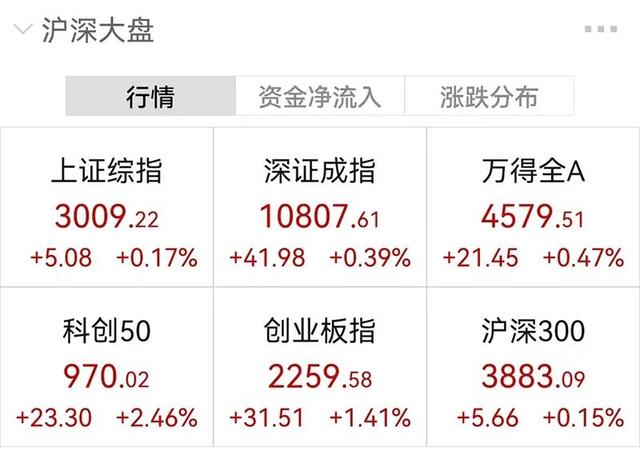 今日早盘,A股市场表现惊艳。在隔夜外盘大幅下挫的背景下,A股三大股指低开后快速拉升,全线翻红。截至午间收盘,上证指数稳守3000点整数关口,创业板指上涨1.41%,科创50指数大涨2.46%。