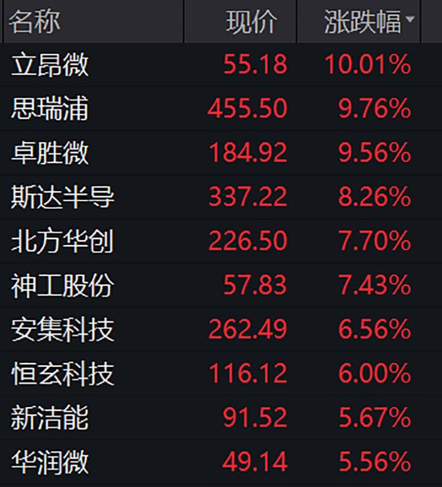 从盘面上看,半导体板块构成早盘推升创业板指、科创50指数的重要力量。截至午间收盘,Wind半导体指数大涨3.58%,立昂微封上涨停,卓胜微、斯达半导、北方华创等龙头公司涨超7%。