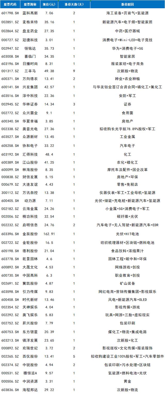 按行业来看,其他涨停个股零星分布于磷化工、氢能源、次新股、汽车电子等板块。