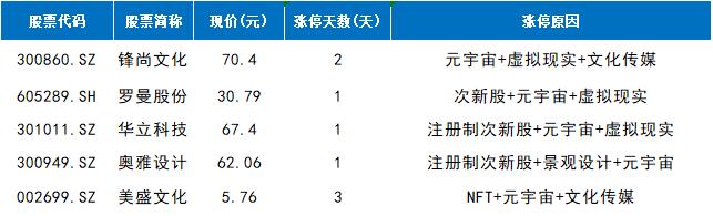 元宇宙概念在经历周一周二短暂的调整后,开启连续3天的反弹,今日更是全线爆发。龙头股美盛文化(002699.SZ)强势涨停,斩获3连板,锋尚文化(300860.SZ)2连板。