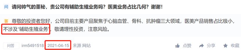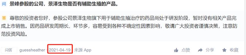 但4月19日就改口称:“参股公司景泽生物旗下用于辅助生殖治疗的药品尚处于研发阶段,暂时没有相关产品完成上市销售。”