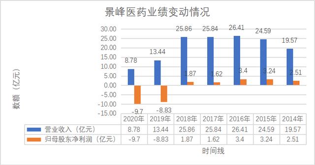 景峰医药蹭热点和控股股东连续减持背后,是连续两年的巨额亏损。年报显示,2014年-2018年,景峰医药累计盈利12.64亿元。但在2019、2020两年间,就突然曝出归属于上市公司股东净利润分别为-8.83亿元、-9.70亿元的逆转。
