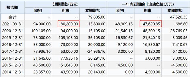 与此同时,公司偏好短期借款,表现出靠举债运转的色彩。wind数据显示,2014年-2020年末,景峰医药的短期借款分别为4.35亿元、5.16亿元、7.79亿元、5.30亿元、7.30亿元、10.91亿元和9.40亿元,截至2021年3月31日,仍有8.02亿元。且截至2021年3月31日有一年内到期的非流动负债4.76亿元,加起来短期负债高达12.78亿元。